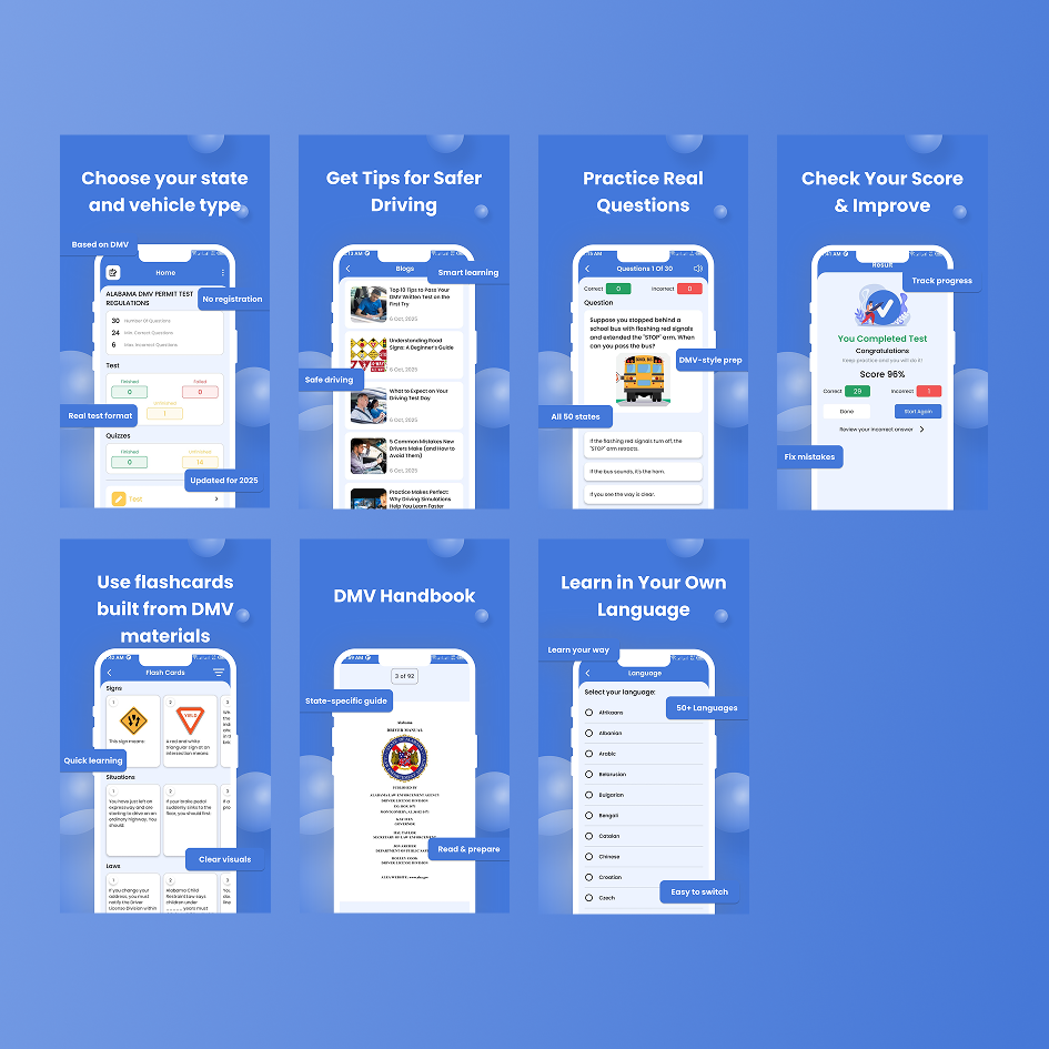 Get ready for your DMV permit test with Ready2Drivee, Ready2Drivee helps you prepare for your DMV written test with real-style practice questions, road signs, and driver manuals for all U.S. states. Whether you’re getting your car, motorcycle, or CDL license, you’ll find everything in one place.